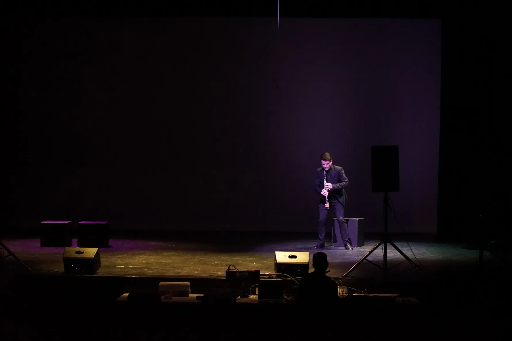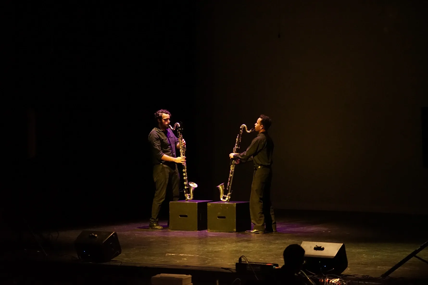 Development of the visual system began shortly afterward in Montreal, at Perte de Signal, where Kalun and Travis prototyped a mobile projection mapping system capable of visually rendering sonic gestures onto architectural surfaces in real time. This system was later integrated into a new iteration of CSA in Copenhagen in 2025, through the efforts of Kirsten and her production company Tonalteatret. There, Denmark-based percussionist Sara Nigard Rosendal joined the project. The group spent several days in residence at the Rhythmic Music Conservatory, culminating in a site-responsive performance at Basement, a decommissioned boiler room in Copenhagen’s west end.